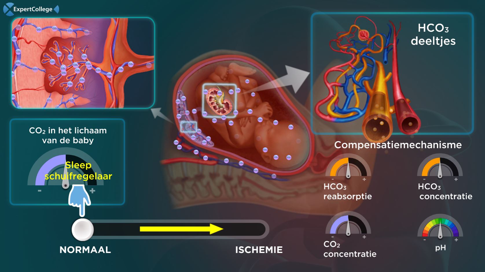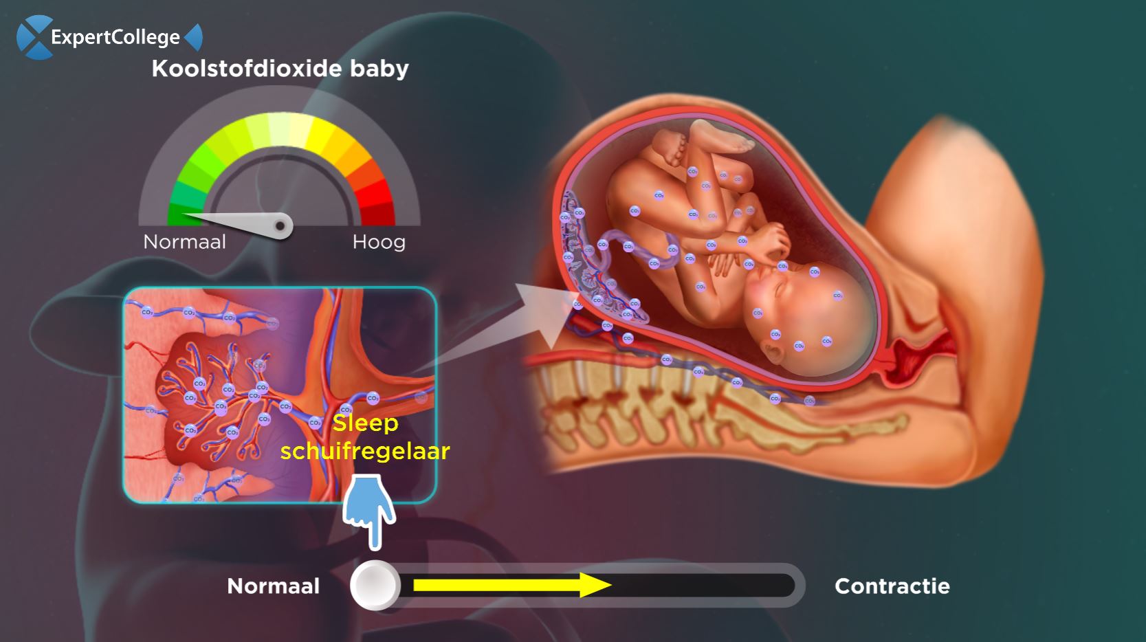 De cellen in het lichaam hebben zuurstof nodig voor de productie van energie. Deze energie wordt vervolgens gebruikt voor celgroei en vele andere activiteiten. Bij celactiviteit komen grote hoeveelheden kooldioxide vrij. De cellen moeten deze kooldioxide kwijtraken om normaal te blijven functioneren. Bij de foetus wordt het foetale bloed via de navelstrengarterie naar de placenta getransporteerd. De rode bloedcellen van...