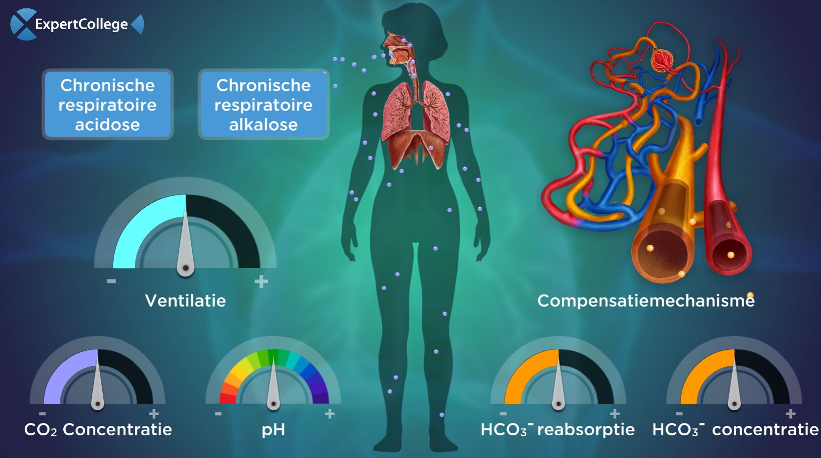 Bij chronische respiratoire acidose spelen dezelfde mechanismen een rol als bij een acute respiratoire acidose, echter hierbij hebben metabole compensatiemechanismen de pH gecorrigeerd. De PCO2 is hoog, net als bij een acute respiratoire acidose. De concentratie HCO3- is eveneens hoog (omdat de nieren onder invloed van de pH extra reabsorptie van bicarbonaat hebben bewerkstelligd). Samenvattend is bij een chronische respiratoire...