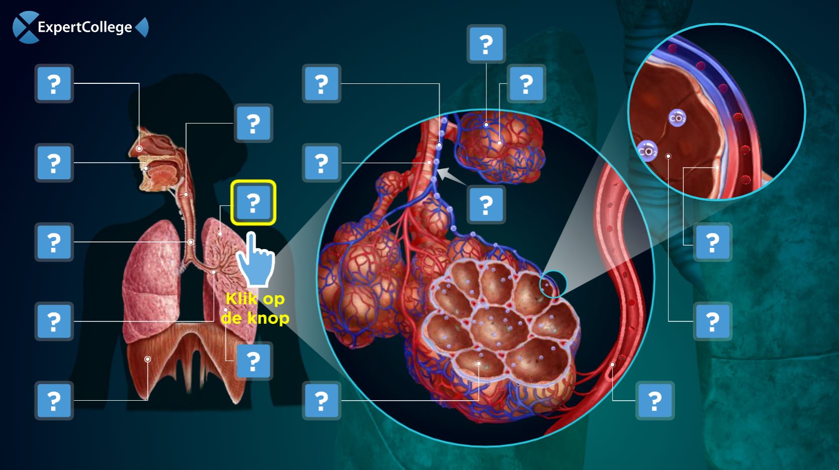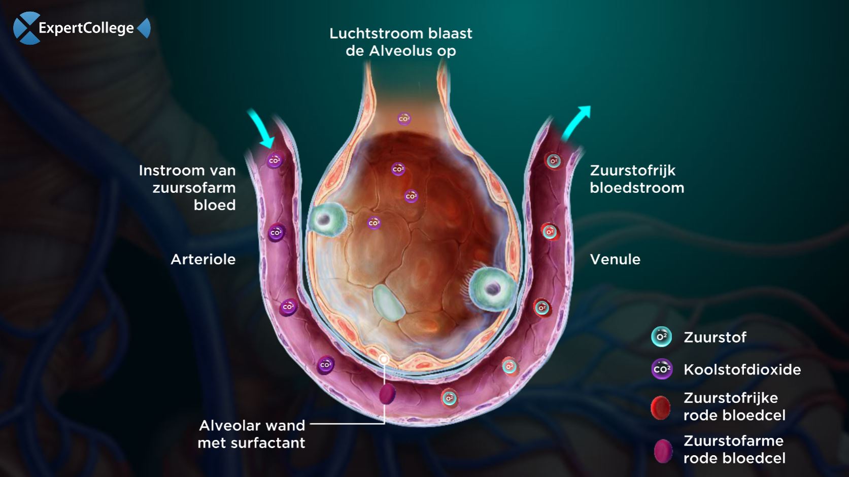 De terminale bronchioli vormen de kleinste vertakkingen van de luchtwegen en monden uit in longtrechtertjes die tientallen ballonachtige zakjes omvatten: de alveoli (longblaasjes). Deze alveoli hebben een zeer dunne wand die bestaat uit slechts ëën cellaag plaveiselepitheel en een basaalmembraan. De alveoli worden omgeven door een dicht netwerk van hele dunne bloedvaten: de alveolaire capillairen. Ook deze bloedvaten hebben een...