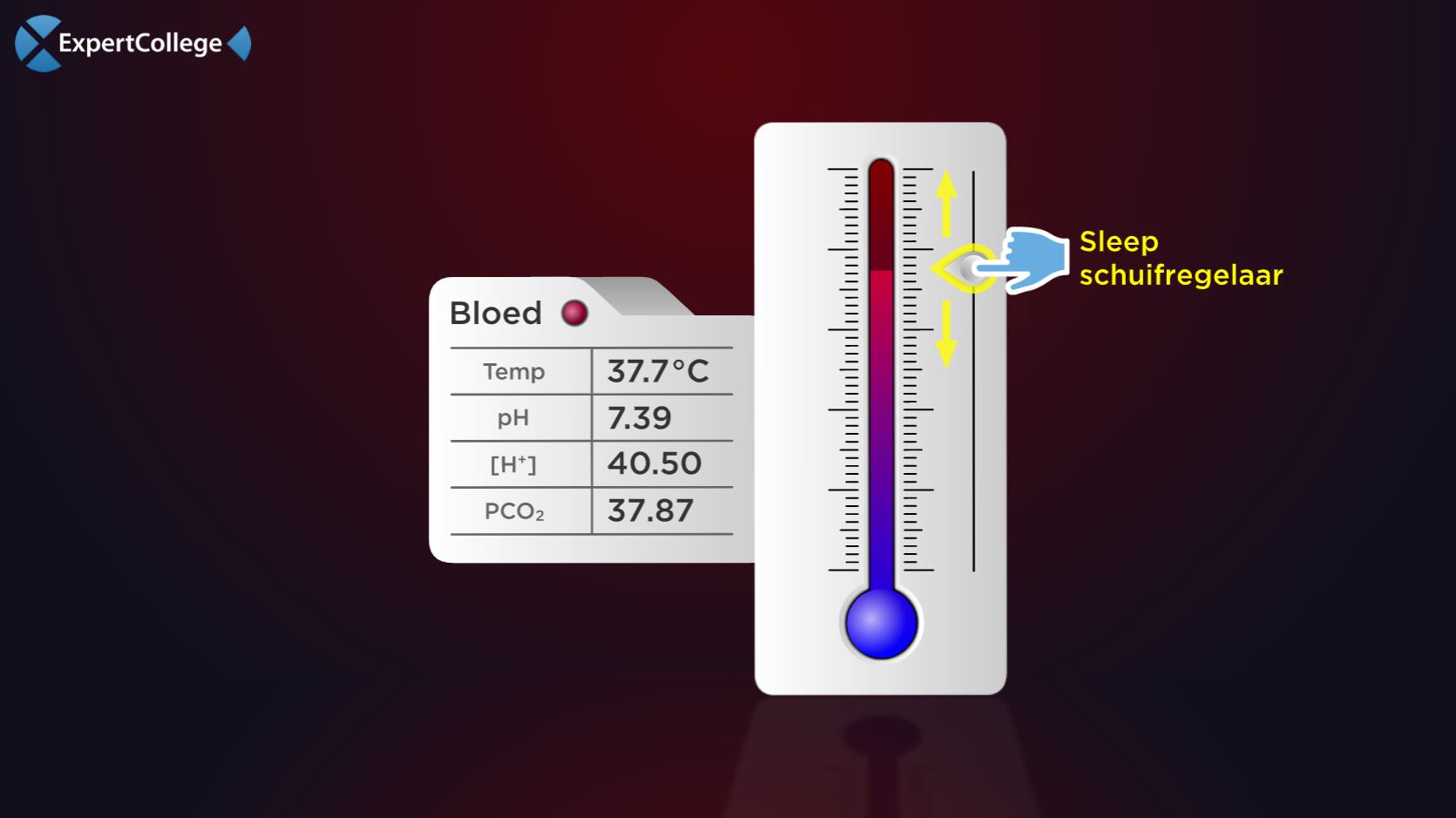 Hemoglobine neemt naarmate het bloed koeler wordt meer H+ ionen op. Hierdoor neemt de concentratie aan vrije H+ ionen in het bloed af en stijgt de pH met ongeveer 0.015 per °C daling. Andersom geldt dat de pH daalt met 0.015 per °C stijging. Hyperthermie leidt tot een verlaging van de pH. Ook de oplosbaarheid van CO2 verandert met de...