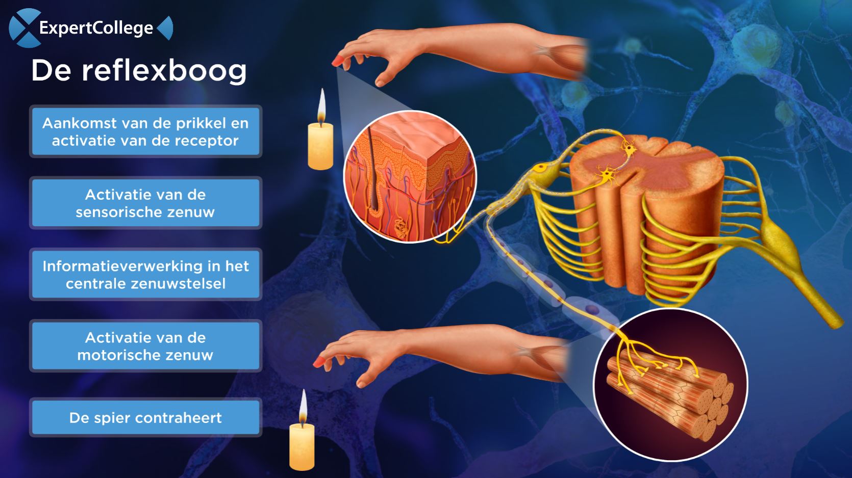 De reflexboog is de naam voor de route die een impuls volbrengt vanaf de plaats van de waargenomen prikkel tot het handelen (vaak een spier). In dit voorbeeld is de hitte van een kaars de waargenomen prikkel. Hierdoor wordt de receptor geactiveerd en de impuls wordt doorgegeven aan de sensorische zenuw. In het centrale zenuwstelsel wordt vervolgens de informatie doorgegeven....