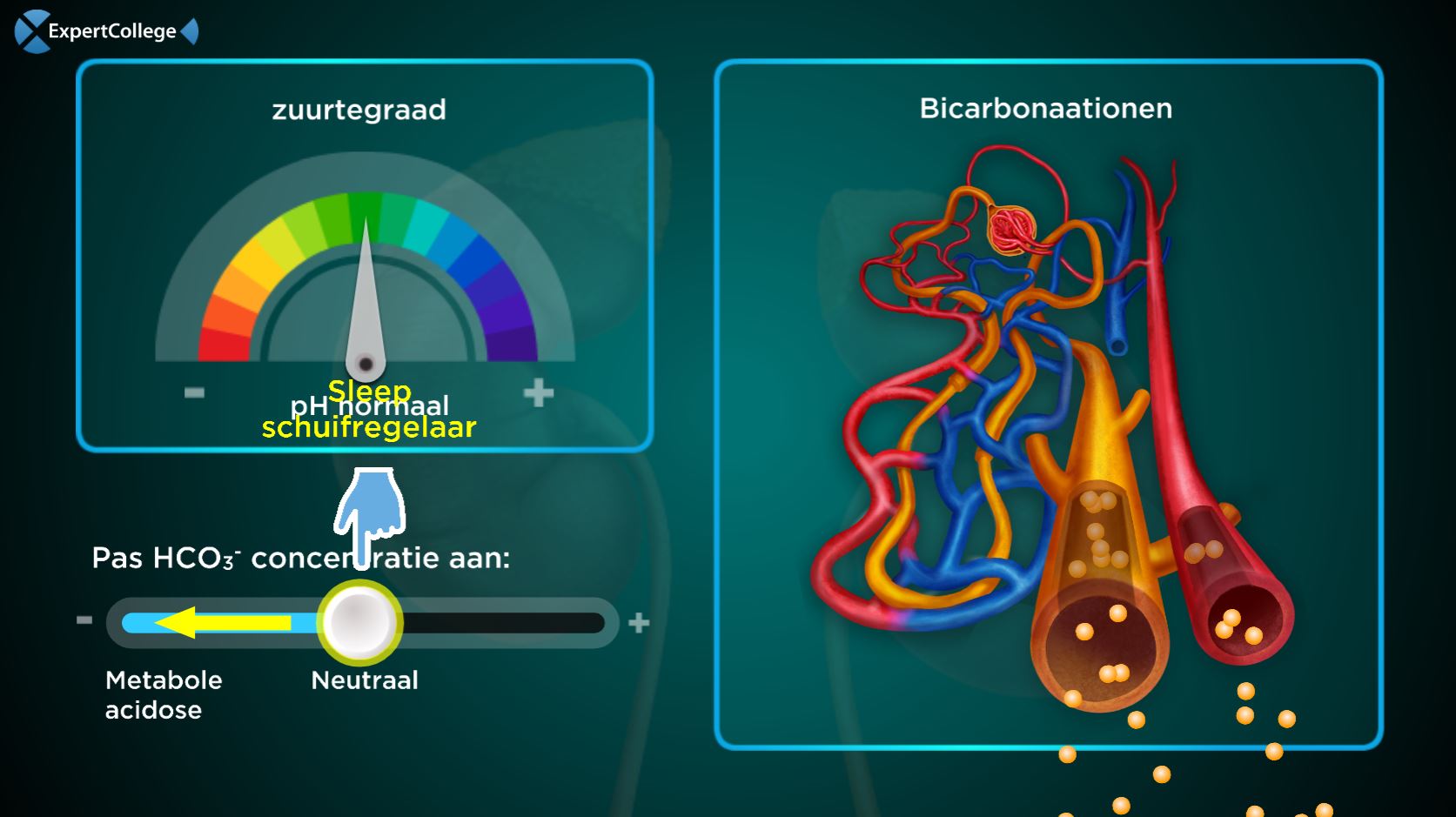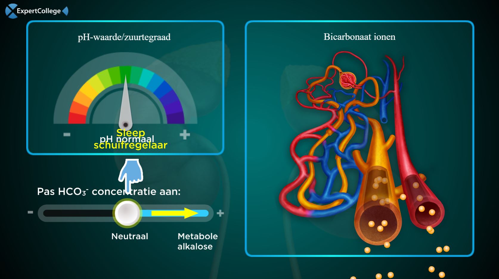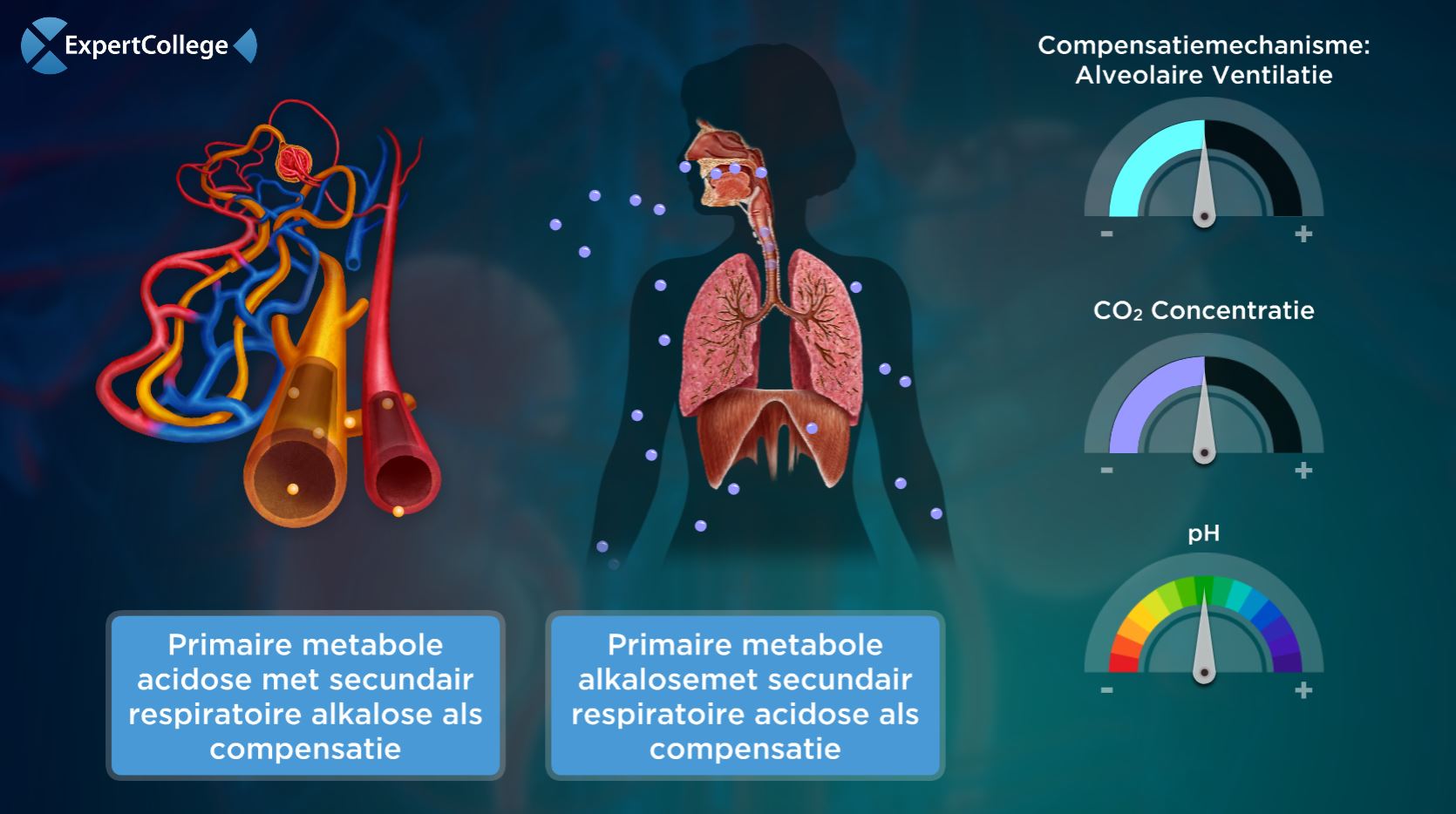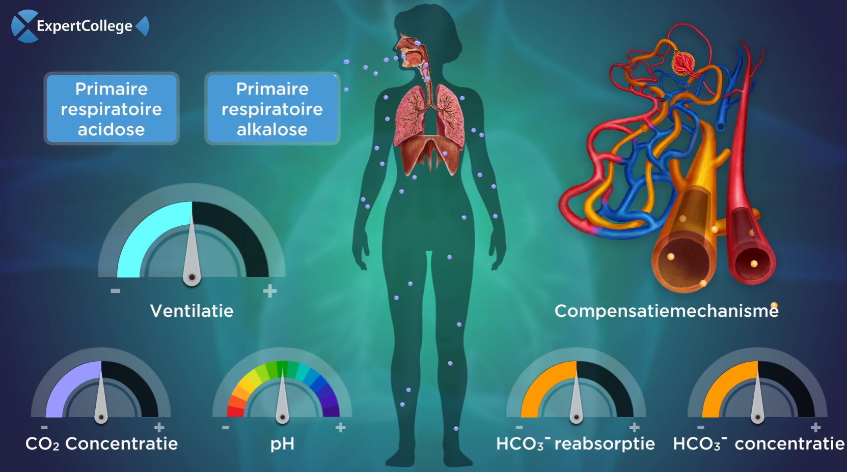 Respiratoire alkalose: Wanneer een patiënt hyperventileert (dit kan vele oorzaken hebben) zal de PCO2 in het bloed dalen. Minder CO2 reageert met het H2O in het bloed waarbij minder H+ ionen ontstaan. De pH van het bloed wordt dus hoger. Metabole acidose als compensatie: De nieren werken na enige tijd (uren tot dagen) de hoge pH tegen door HCO3- (bicarbonaat)...