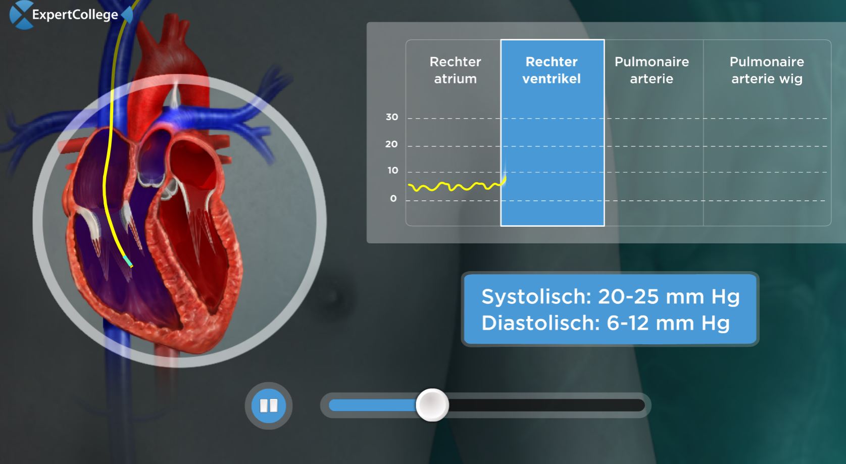Net zoals in het rechter ventrikel, is de druk van de Arteria Pulmonalis aan het begin van de hartcontractie (systole) ongeveer 25 mmHg. In tegenstelling tot de ventriculaire druk, daalt de pulmonale arteriële druk niet sterk na de systole. Na het sluiten van de pulmonalisklep daalt de druk geleidelijk omdat het bloed door de smallere vaten moet stromen. Met een...