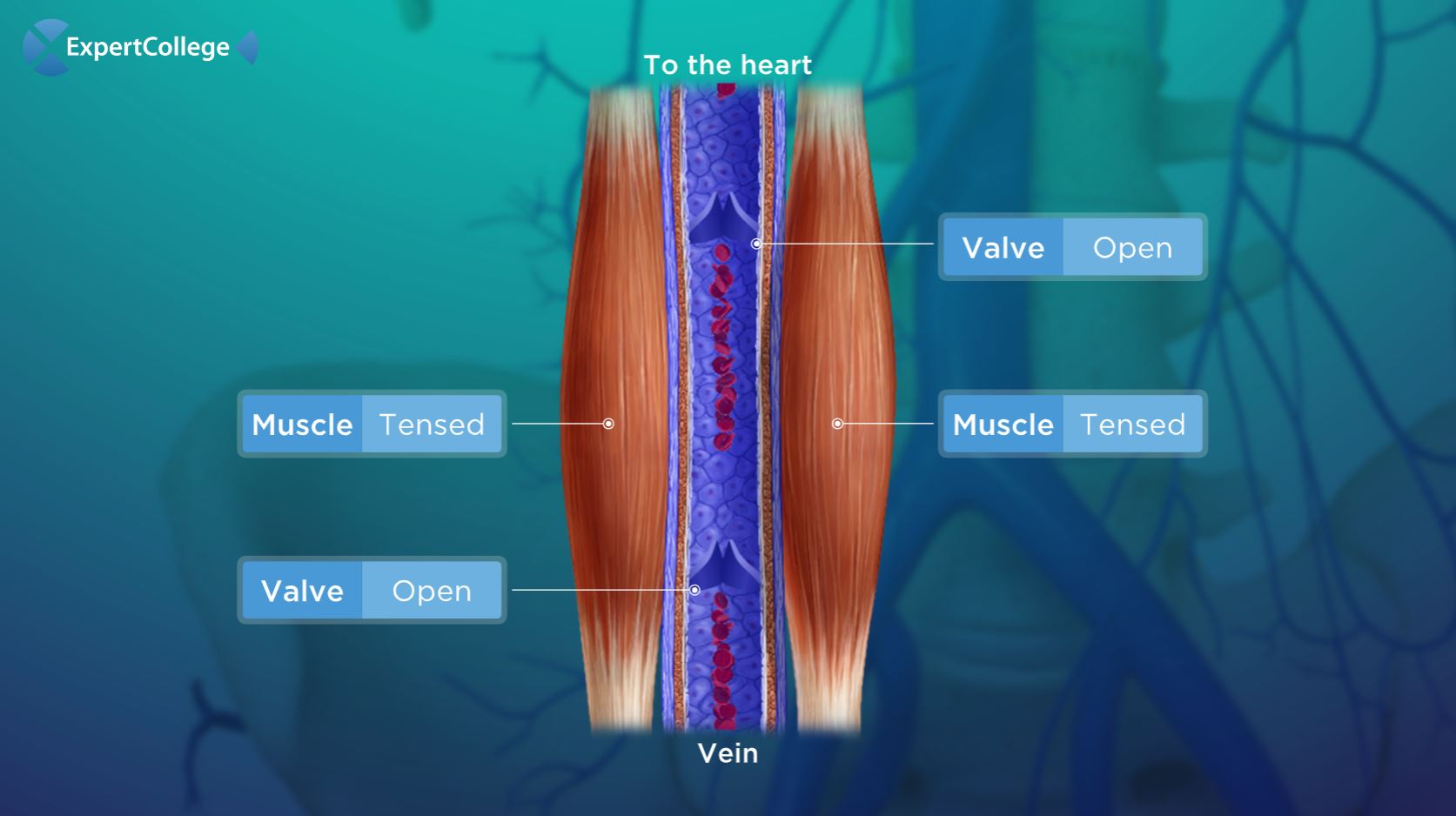 Wanneer het bloed in het veneuze systeem terecht komt is de druk al significant gedaald. De gemiddelde bloeddruk in het veneuze systeem is 2 mmHg, in vergelijking met een gemiddelde van 100 mmHg in het arteriële systeem. De lage veneuze druk is nauwelijks in staat om het bloed terug naar het hart te laten stromen, met name in de benen...