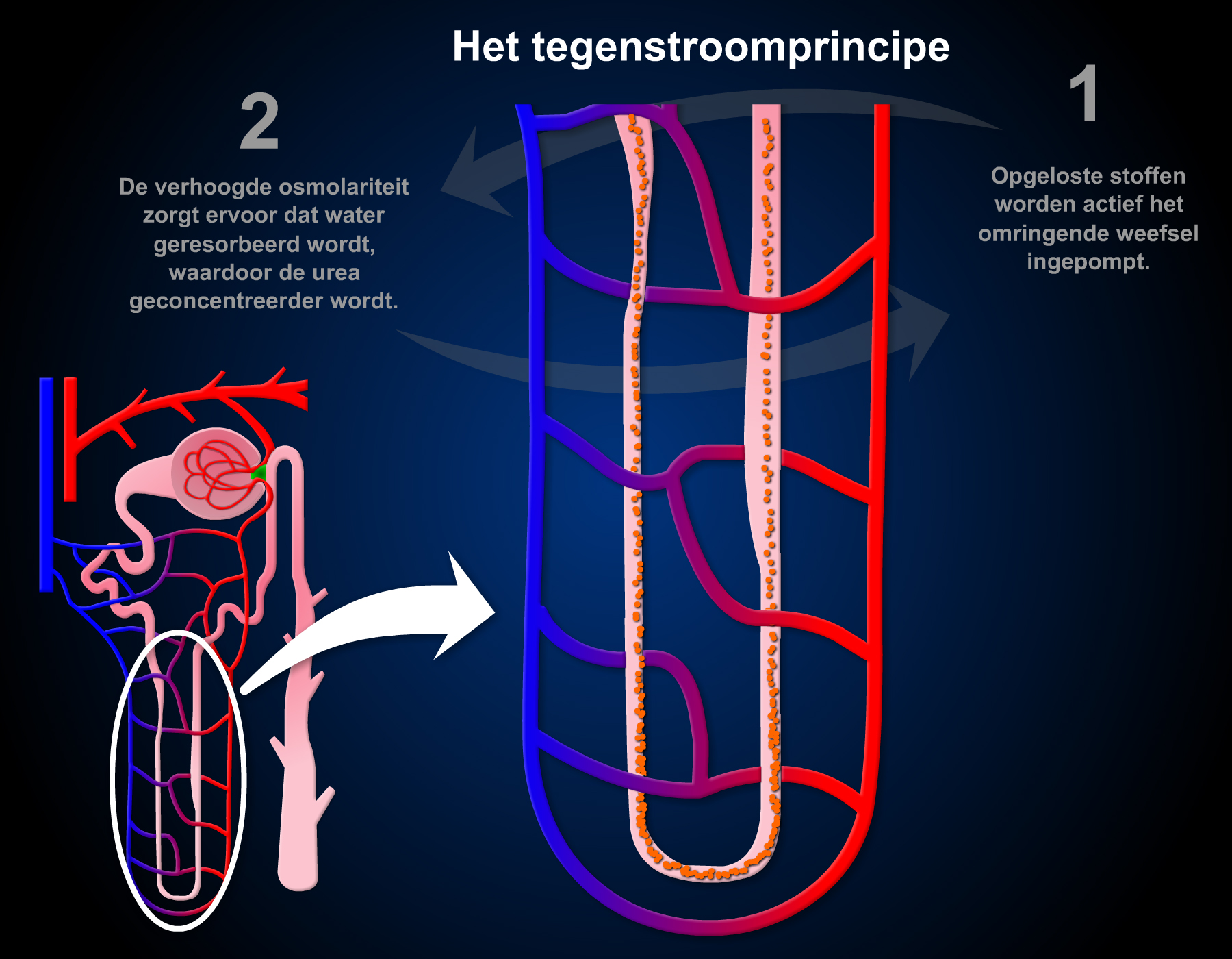 Nadat de voorurine de proximale tubulus heeft gepasseerd komt het terecht in de lis van Henle. Alhier wordt nog eens ongeveer 20-25% van het aanwezige water gereabsorbeerd. Dit wordt mogelijk gemaakt door middel van het tegenstroomprincipe: De opstijgende gedeeltes van de lis van Henle, die naar de cortex toe lopen, zijn niet doorlaatbaar voor water. De epitheelcellen van de dikke...