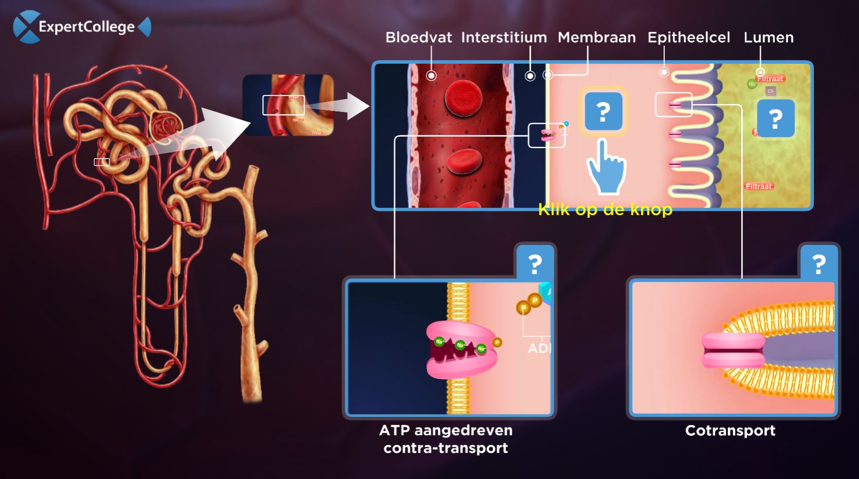 De reabsorptie van natrium van de proximale tubuluscel naar het interstitium is een primair actief transportproces. De Na+-K+-ATPase pomp in het basolaterale membraan van de tubuluscellen transporteert steeds 3 natriumionen naar het renale interstitium en 2 kaliumionen naar de proximale tubuluscel. Hierdoor wordt de natriumconcentratie in de tubuluscellen laag gehouden in vergelijking met de natriumconcentratie in het tubulaire lumen. De...